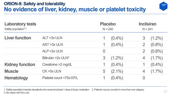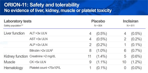 ▲在ORION-9,10,11中均未發(fā)現(xiàn)與inclisiran相關(guān)的肝臟、腎臟毒性(圖片來源:參考資料[4],[5])